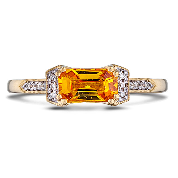 10K yellow gold Padparadscha color orange sapphire and diamond ring featuring a 1.01 carat Padparadscha yellow orange sapphire, accented by 0.12 carat total weight round brilliant cut diamonds.