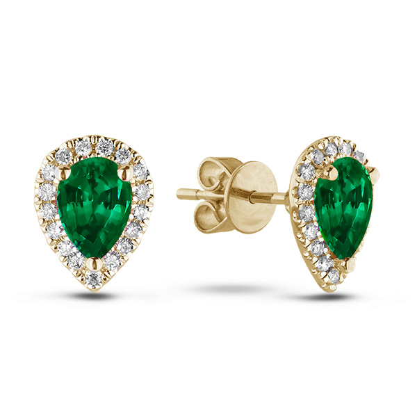 10K yellow gold halo earrings featuring 1.35 carat total weight pear shaped emeralds, accented by 0.22 carat total weight round brilliant cut melee Canadian diamonds.