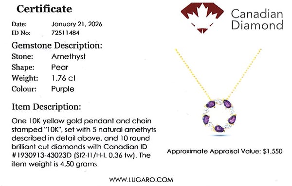 10K yellow gold circle necklace featuring 1.76 carat total weight amethyst, accented by 0.36 carat total weight round brilliant cut Canadian diamonds.