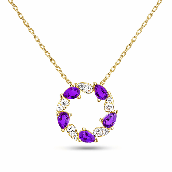 Pear Shape Amethyst And Canadian Diamond Circle Necklace In Yellow Gold