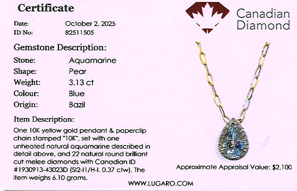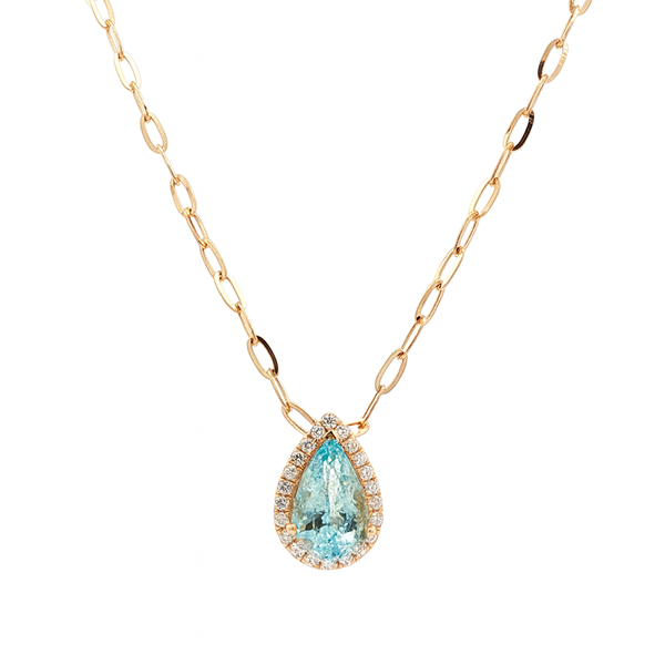 Be the first to review “Pear Shape Aquamarine and Canadian Diamond Halo Paperclip Chain Pendant in Yellow Gold”