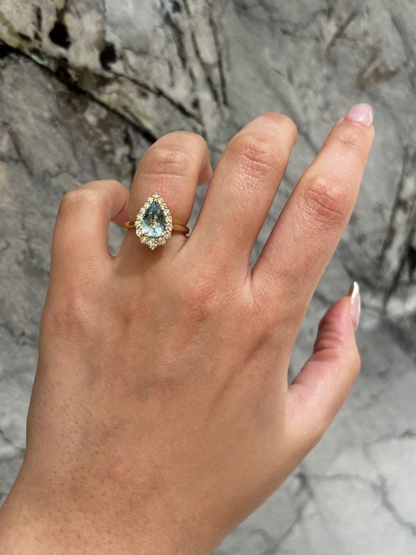 Be the first to review “Pear Shaped Aquamarine and Canadian Diamond Halo Ring in Yellow Gold”