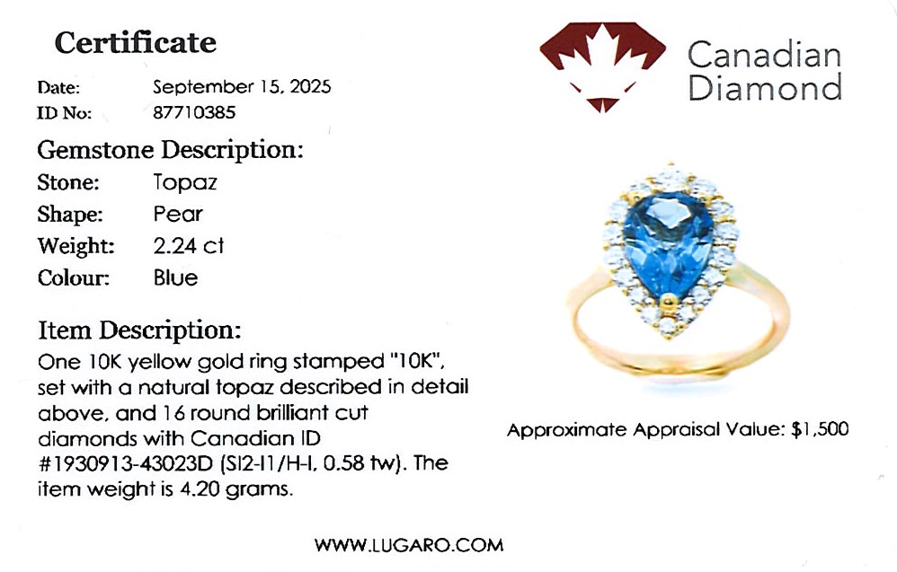 Blue topaz and diamond halo ring includes a Canadian diamond certificate.