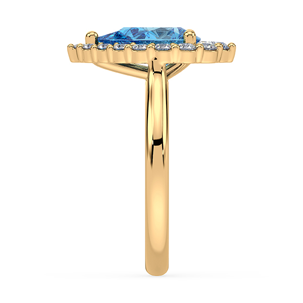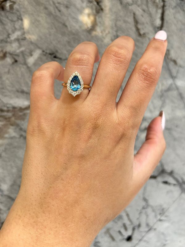 Be the first to review “Pear Shaped Blue Topaz and Canadian Diamond Halo Ring in Yellow Gold”
