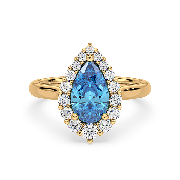 Pear Shaped Blue Topaz and Canadian Diamond Halo Ring in Yellow Gold