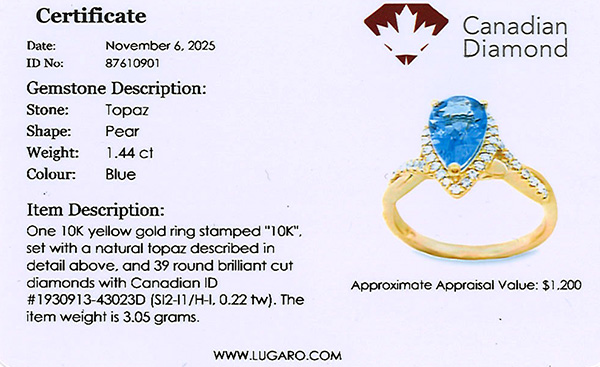 10K yellow gold ring featuring a 1.44 carat pear shape blue topaz, accent by 0.22 carat total weight round brilliant cut melee Canadian diamonds.