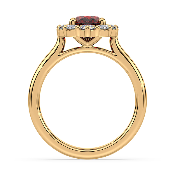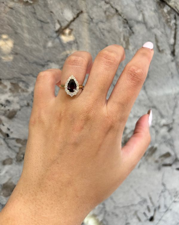 Be the first to review “Pear Shaped Garnet and Canadian Diamond Halo Ring in Yellow Gold”