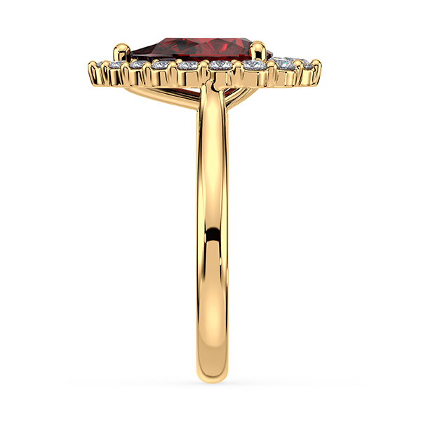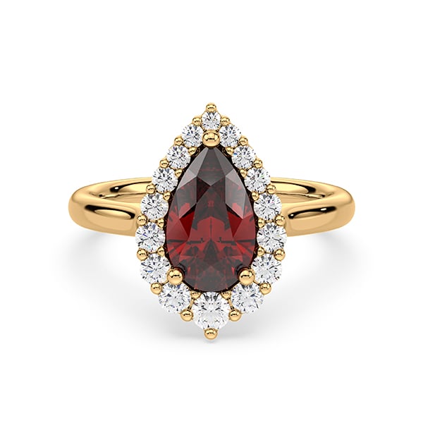 Pear Shaped Garnet and Canadian Diamond Halo Ring in Yellow Gold