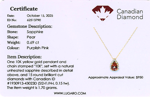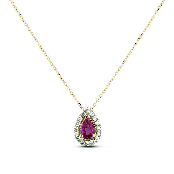 Be the first to review “Pear-Shaped Pink Sapphire and Canadian Diamond Halo Pendant in Yellow Gold”