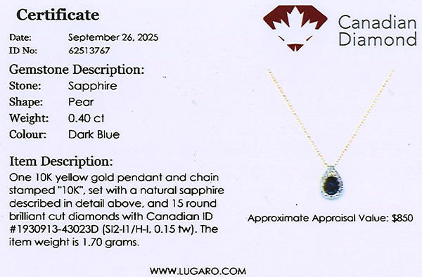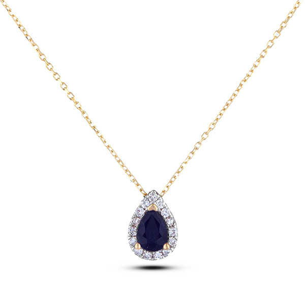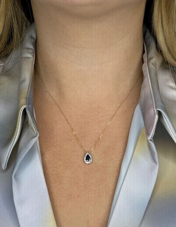 Be the first to review “Pear-Shaped Sapphire and Canadian Diamond Halo Pendant in Yellow Gold”