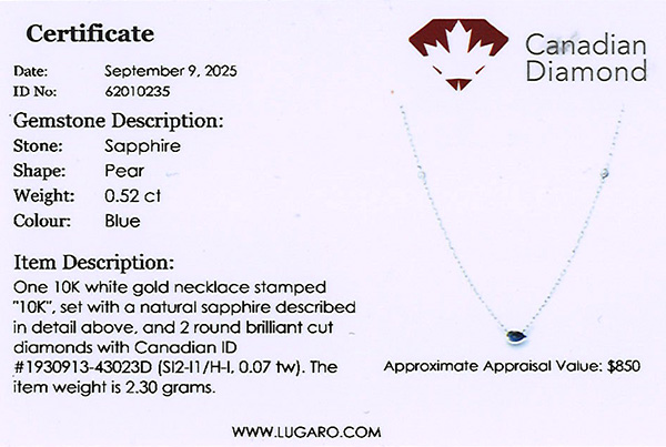Necklace included a Canadian diamond certificate.
