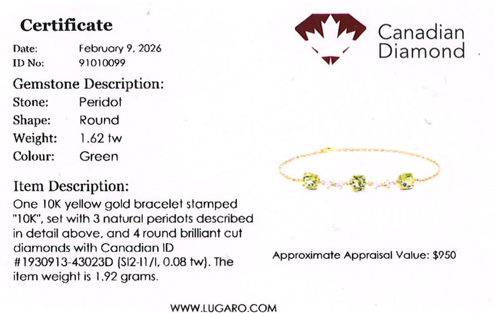 10K yellow gold dainty chain bracelet featuring 1.62 carat total weight peridot, accented by 0.08 carat total weight melee Canadian diamonds.