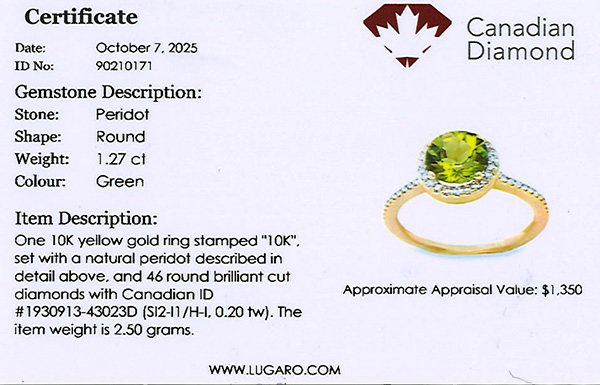 10K yellow gold halo ring featuring a 1.27 carat round cut peridot, accented by 0.20 carat total weight round brilliant cut melee Canadian diamonds.