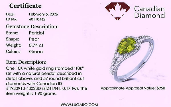 Ring includes a Canadian diamond certificate.