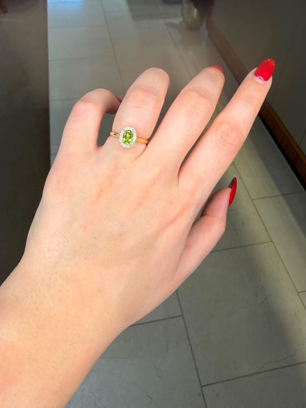 Be the first to review “Peridot & Canadian Diamond Halo Ring in Yellow Gold”