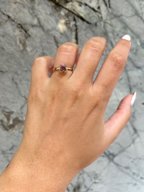 Be the first to review “Pink Sapphire and Canadian Diamond Flower Ring in Yellow Gold”