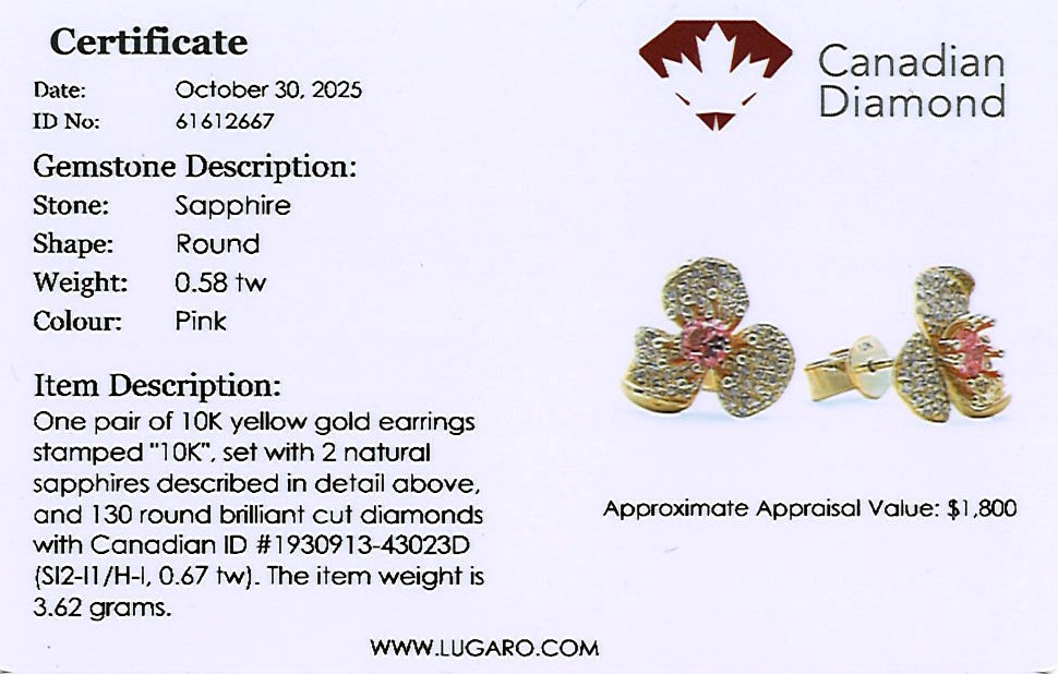 Flower stud earrings include Canadian diamond certificates.
