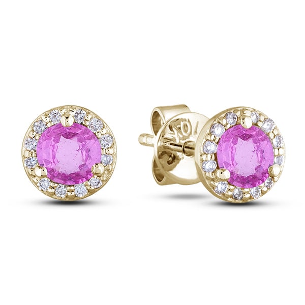 Pink Sapphire and Diamond Halo Stud Earrings in Yellow Gold
