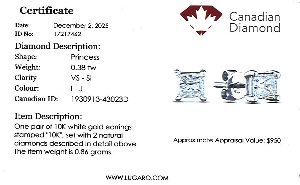 10K white gold stud earrings featuring 0.38 carat total weight princess cut Canadian diamonds.