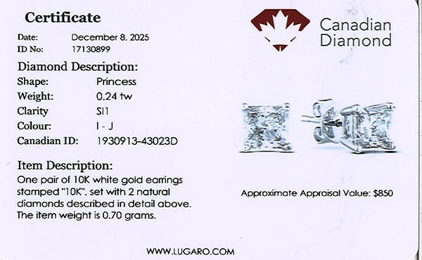 10K white gold princess cut diamond stud earrings featuring 0.24 carat total weight princess cut Canadian diamonds.