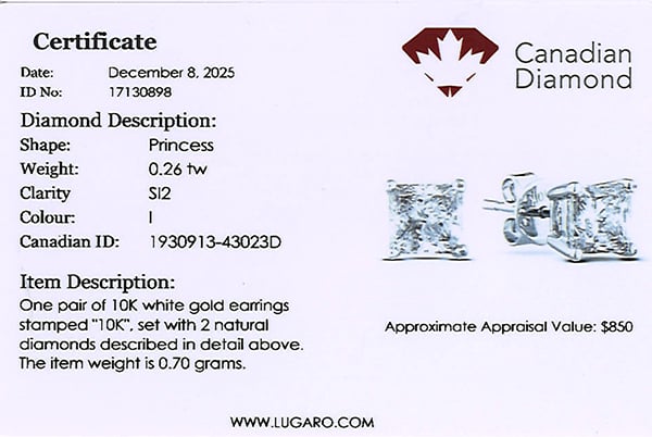10K white gold princess cut diamond stud earrings featuring 0.26 carat total weight princess cut Canadian diamonds.