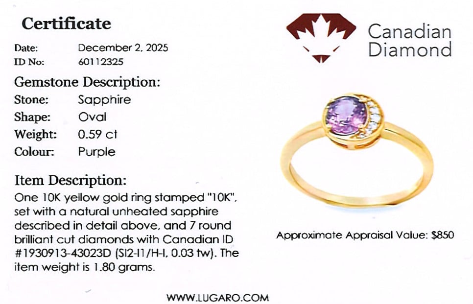 10K yellow gold ring featuring 0.59 carat total purple sapphire, accented by 0.03 carat total weight round brilliant cut Canadian diamonds.