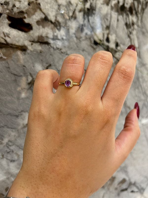 Be the first to review “Purple Sapphire and Canadian Diamond Half Halo Ring in Yellow Gold”