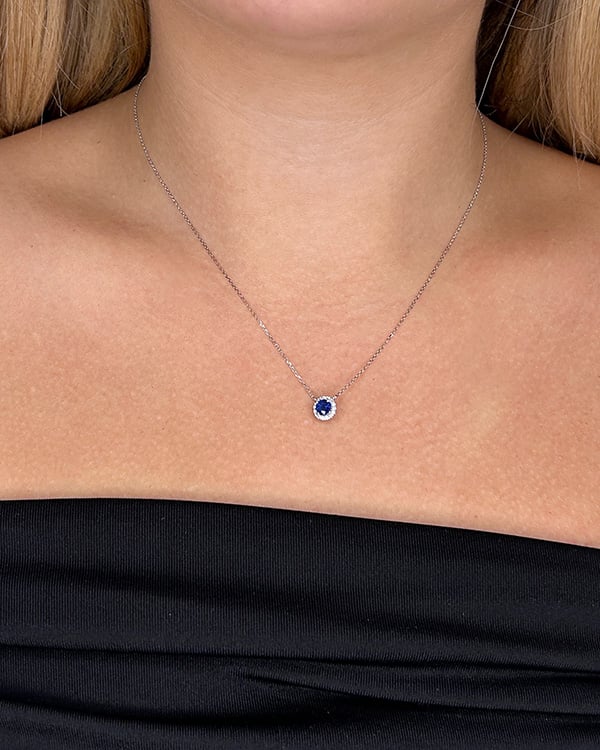 Round Blue Sapphire and Canadian Diamond Halo Necklace in White Gold