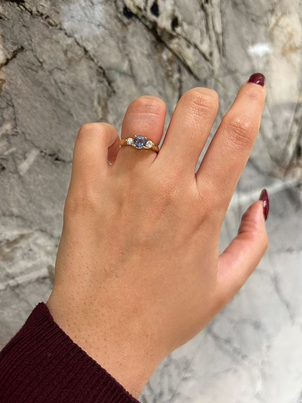 Be the first to review “Round Cut 1.01 Carat Blue Sapphire and Canadian Diamond Three Stone Ring in Yellow Gold”