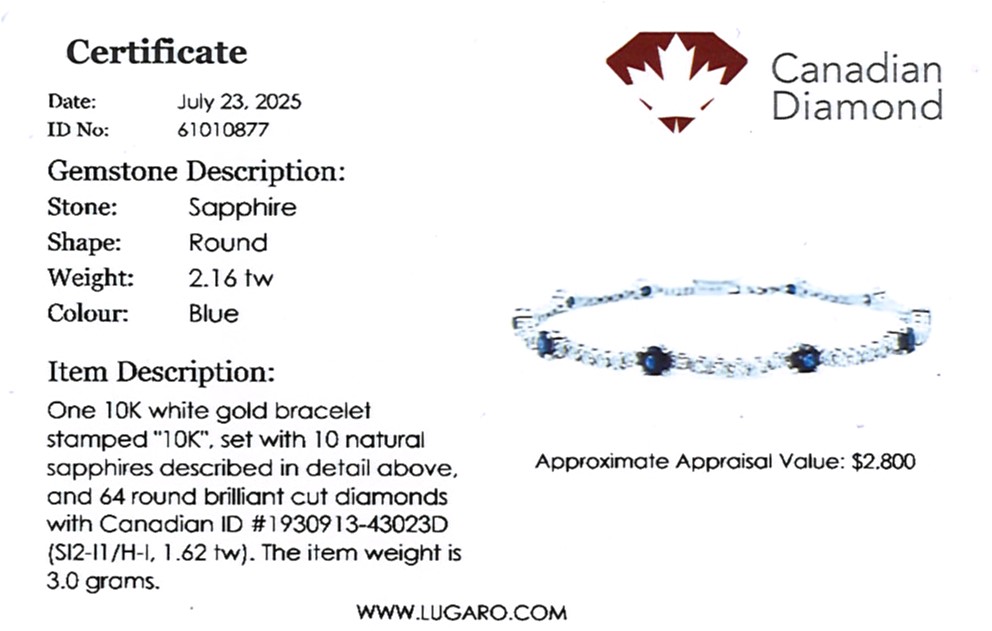 Sapphire and diamond tennis bracelet includes Canadian Diamond certificate.