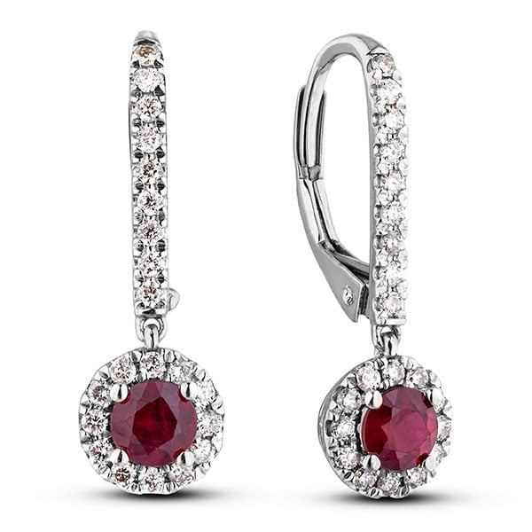 10K white gold dangle hoop earrings featuring 0.57 carat total weight round shape rubies, accented by 0.33 carat total weight round brilliant cut Canadian diamonds.