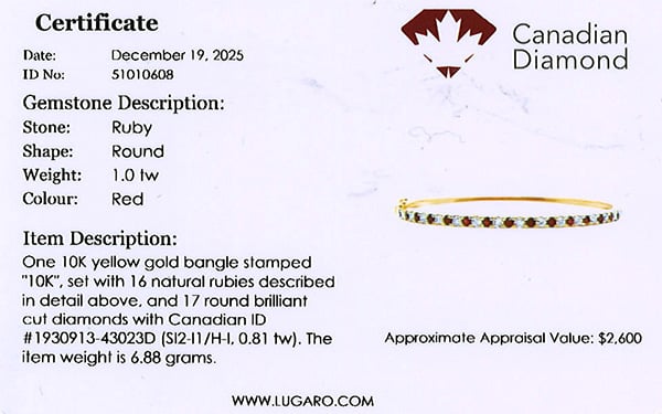 Bangle bracelet includes Canadian diamond certificate.