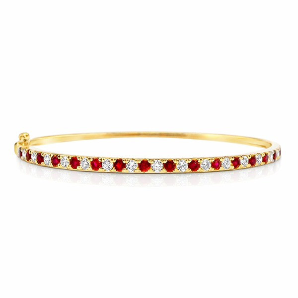 10K yellow gold bangle featuring 1.00 carat total weight round rubies, accented by 0.81 carat total weight round brilliant cut melee Canadian diamonds.