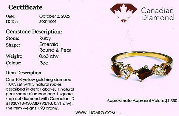 10K yellow gold ring featuring 0.63 carat total weight ruby, accented by 0.21 carat total weight Canadian diamonds.