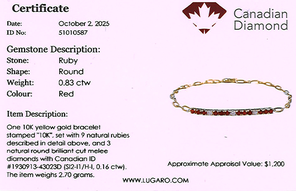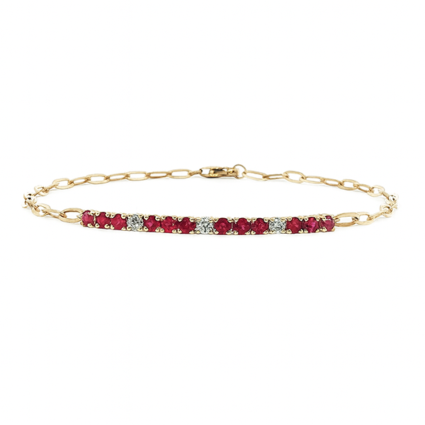10K yellow gold paperclip chain bracelet featuring 0.83 carat total weight rubies, accented by 0.16 carat weight round brilliant cut Canadian diamonds.