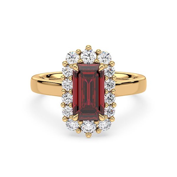 18K yellow gold halo ring featuring a 2.36 carat Thai ruby, accented by 0.17 carat total weight round brilliant cut De Beers Forevermark diamonds and 0.56 carat total weight round brilliant cut melee diamonds.