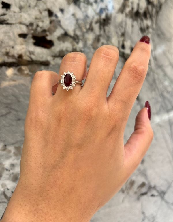 18K white gold halo ring featuring a 2.70 carat oval shaped ruby, accented by 0.28 carat total weight emerald cut De Beers Forevermark diamonds and 0.55 carat total weight round brilliant cut melee diamonds.