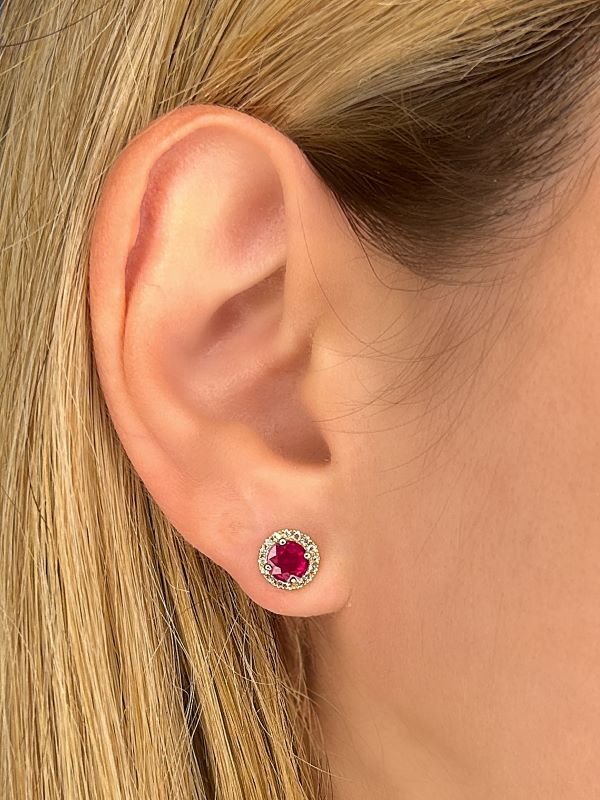 Ruby and Diamond Halo Earrings in 14K Yellow Gold