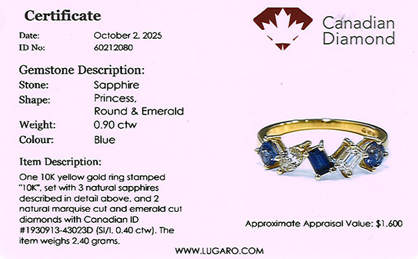 10K yellow gold ring featuring 0.90 carat total weight sapphire, accented by 0.40 carat total weight Canadian diamonds.