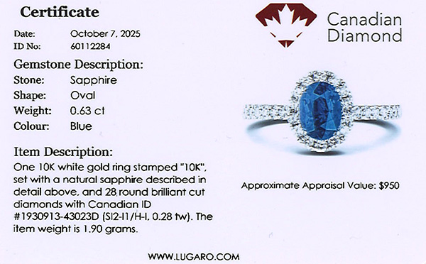 10K white gold halo ring featuring a 0.63 carat sapphire, accented by 0.28 carat total weight round brilliant cut melee Canadian diamonds.