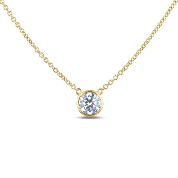 10K yellow gold bezel set solitaire diamond necklace featuring a 0.25 carat round brilliant cut Canadian diamond.