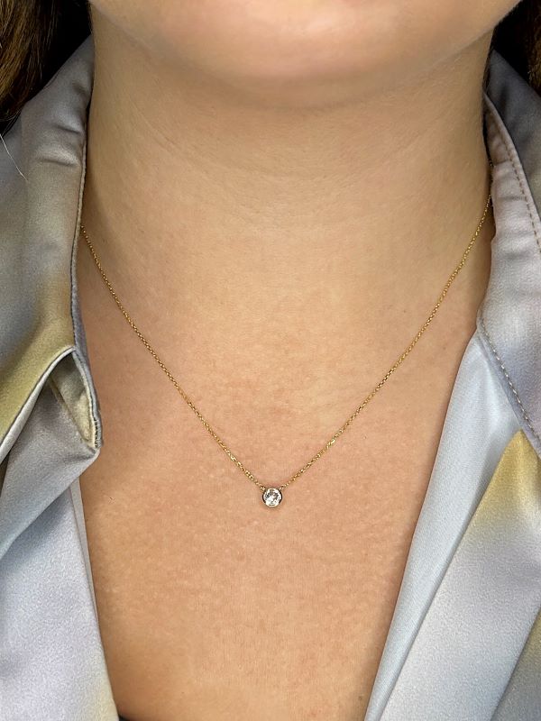 10K yellow gold bezel set solitaire diamond necklace featuring a 0.38 carat round brilliant cut Canadian diamond.