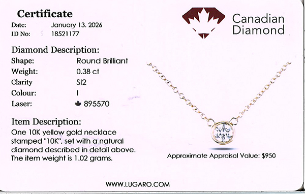 Solitaire diamond necklace includes a Canadian Diamond certificate.