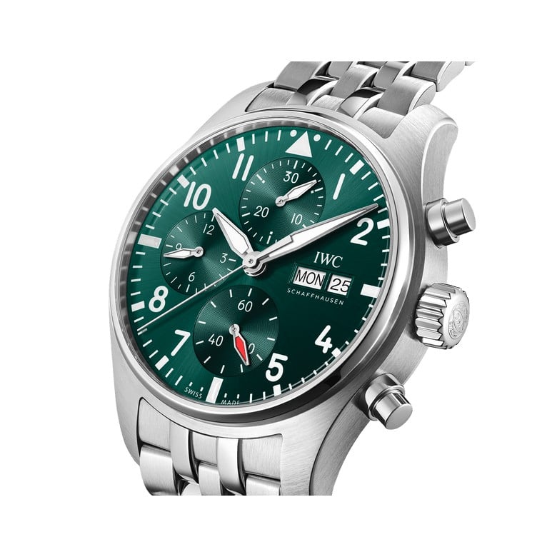 • Functions: Small hacking seconds, IWC bracelet quick-change system, Sapphire glass, convex, antireflective coating on both sides, Glass secured against displacement by drop in air pressure, Day and date display, Chronograph function with hours, minutes and seconds
