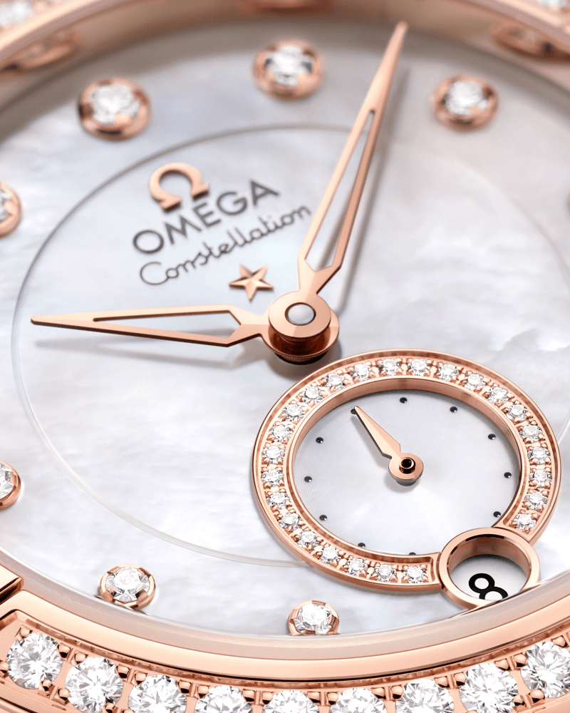 The dramatic and enduring design of the OMEGA Constellation is characterised by its famous half-moon facets, as well as the “claws” on the side of the case. This 34 mm model in 18K Sedna™ gold and stainless steel features a diamond-paved bezel, white pearled mother-of-pearl dial, and a round date window at the 6 o’clock position. The incremental diamond hour markers are presented in 18K Sedna™ gold holders, while the Small Seconds subdial ring is also crafted in 18K Sedna™ gold and set with diamonds. Presented on a light pink leather strap, the timepiece is driven by the OMEGA Co-Axial Master Chronometer Calibre 8802, visible through the domed scratch-resistant sapphire crystal.