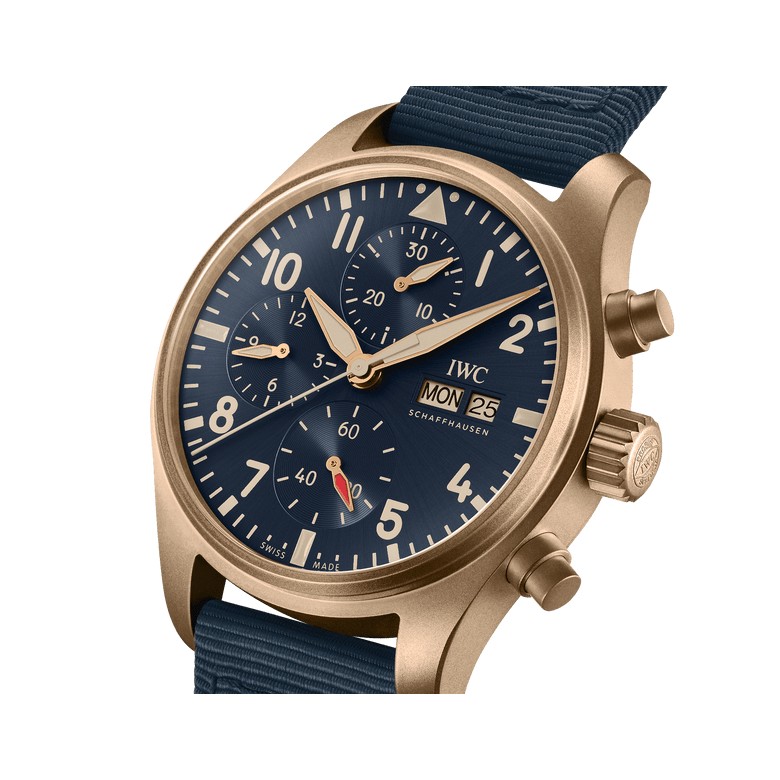 • Functions: Small hacking seconds, IWC bracelet quick-change system, Sapphire glass, convex, antireflective coating on both sides Glass secured against displacement by drop in air pressure, Day and date display, Chronograph function with hours, minutes and seconds