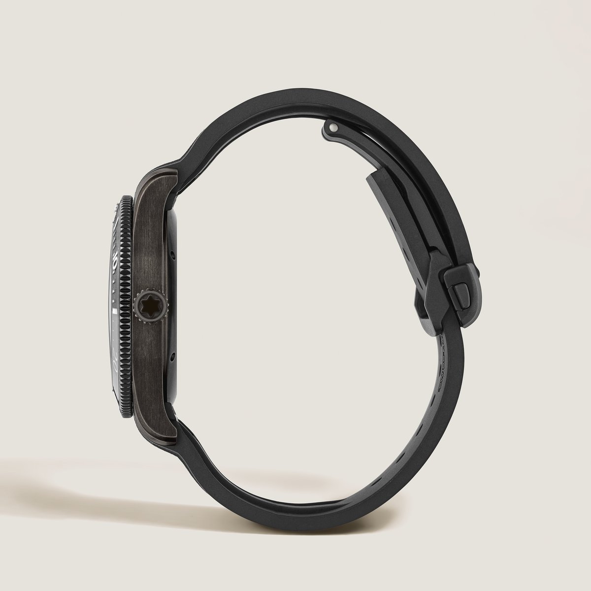 The Montblanc Iced Sea Automatic Date 0 Oxygen with gray sfumato glacier pattern dial gives the impression of looking into the depths of a glacier. Inspired by the Mer de Glace, this glacial texture was achieved using an almost-forgotten ancestral technique called gratté-boisé. The timepiece is housed in a 41 mm distressed steel case totally devoid of oxygen and comes with a unidirectional rotatable bezel with black ceramic insert lowered by laser from 0-15 minutes, a 3D engraving on the case back, and an interchangeable black rubber strap with fine adjustment system. The timepiece conforms to the ISO 6425 norm for scuba diving and comes with a water resistance of 300 meters.