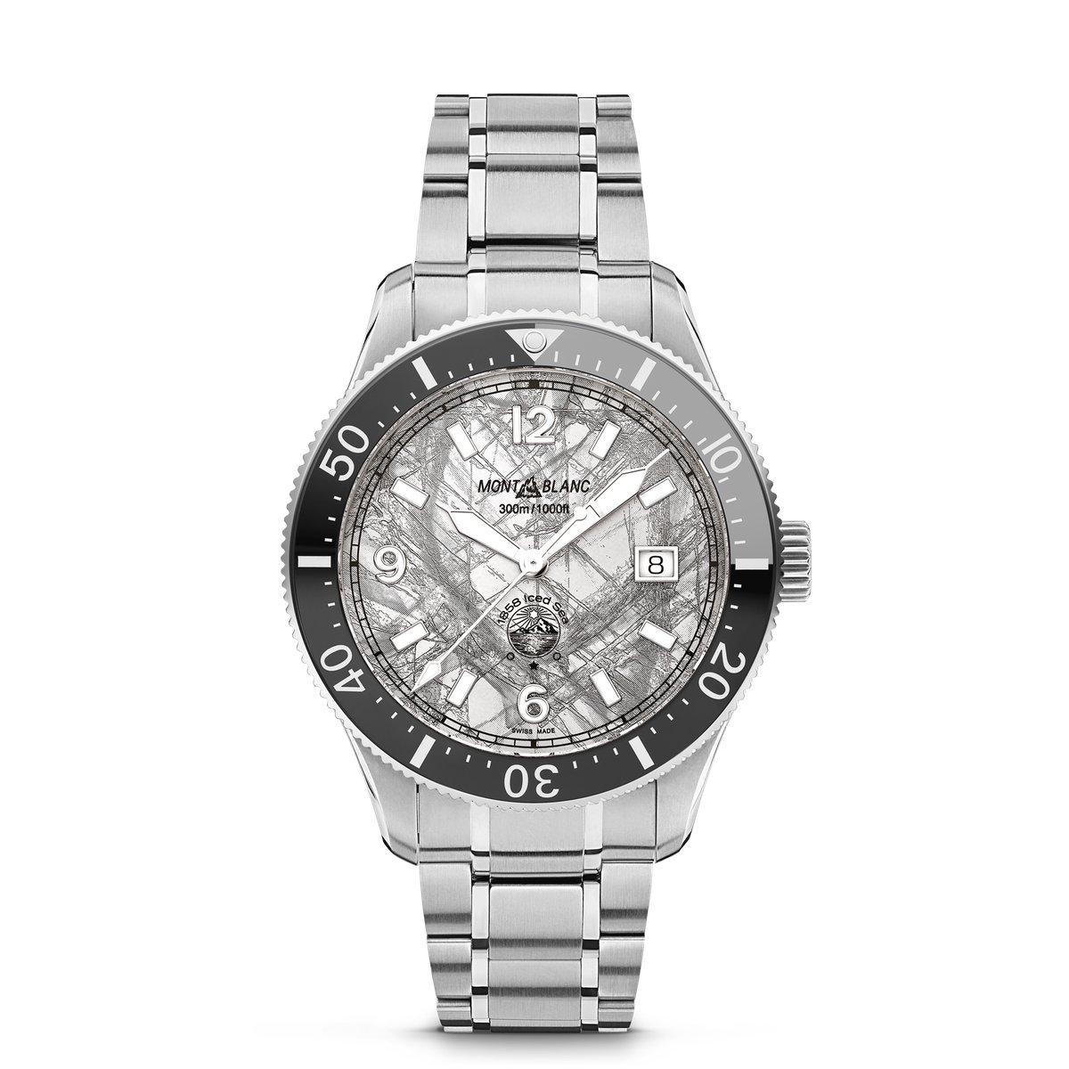The Montblanc Iced Sea Automatic Date with grey glacier pattern dial gives the impression of looking into the depths of a glacier with all its minerals captured in time for millennia. Inspired by the Mer de Glace, this glacial texture was achieved using an almost-forgotten ancestral technique called gratté-boisé. The 41mm timepiece comes with a stainless steel interchangeable bracelet which can be quickly and easily switched for a black rubber strap with grey outline without the need to return to the boutique or the use of any tools. It is also adjustable on the wrist when wearing the watch for diving. The timepiece conforms to the ISO 6425 norm for scuba diving and comes with a water resistance of 300 metres and features luminescent markings for reading in low light.