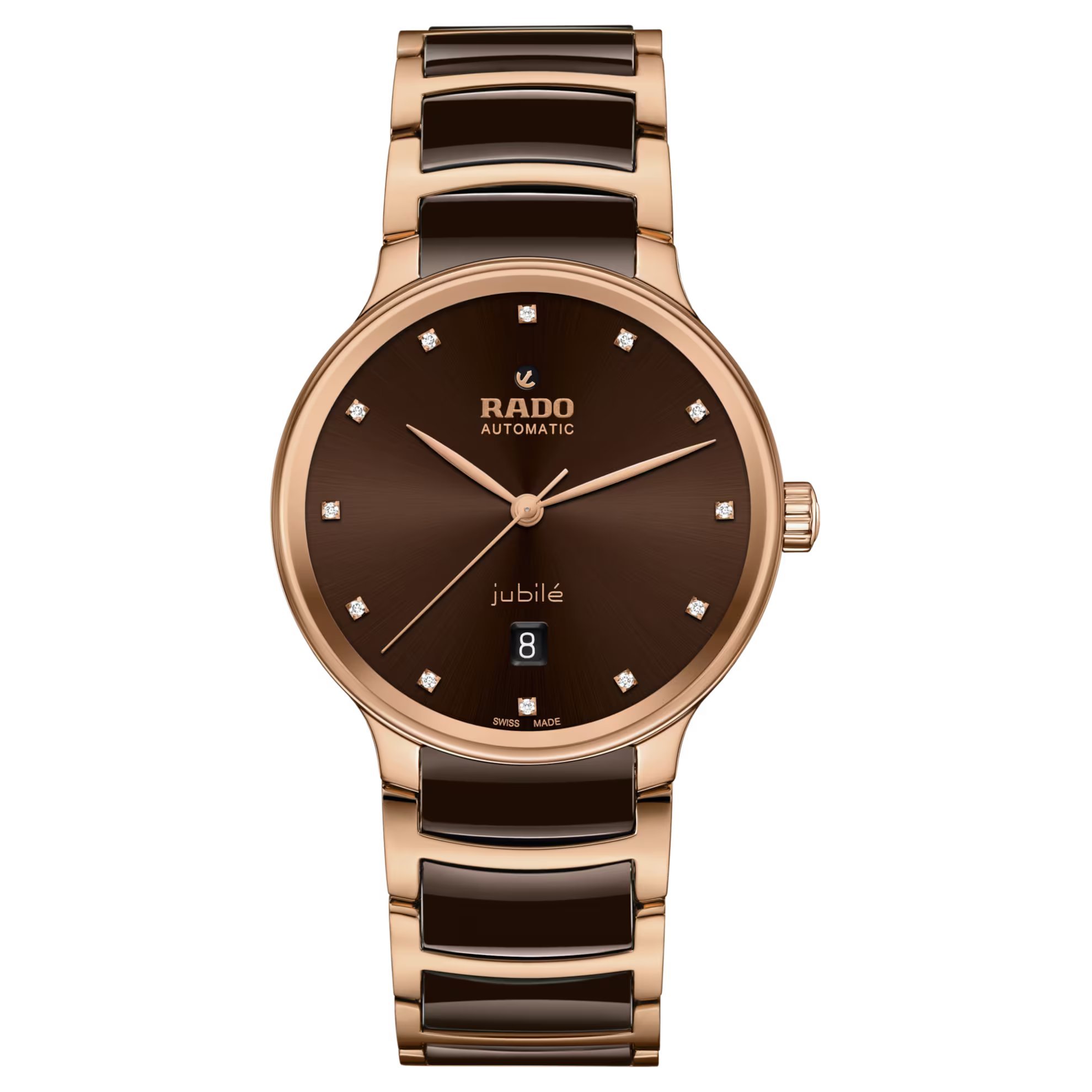 The classic Centrix Automatic Diamonds watch has been reworked not only technically, but also aesthetically. The modified model has a rounded sapphire crystal that extends all the way to the edge and a curved case blending with the curved crystal edge. The overall appearance of this iconic timepiece is completed with adjusted case lugs and a bracelet made of polished rose-gold-coloured PVD-coated stainless steel with brown high-tech ceramic middle links. The brown sunray dial with 12 diamonds, emphasised with the printed “jubilé” logo, matches perfectly with the rose-gold-coloured hands. Inside, the three-hand calibre R763 movement exceeds standard accuracy test requirements from 3 to 5 positions, thanks to its antimagnetic Nivachron™ hairspring for increased reliability and accuracy. The watch is water resistant down to 50 m and offers 80 hours of power reserve.