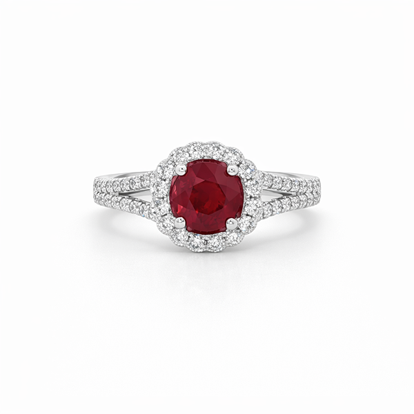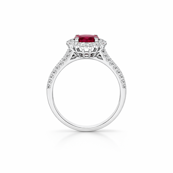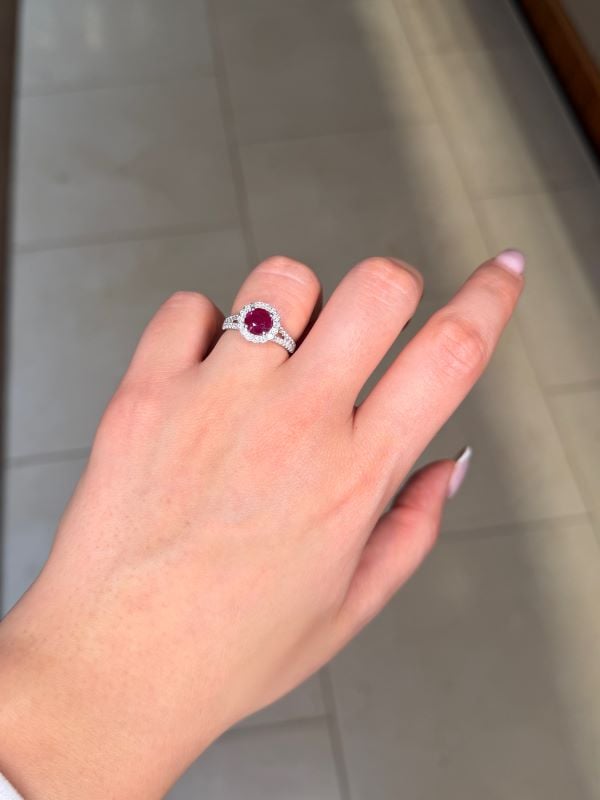 Be the first to review “Thailand Origin 1.12 Carat Ruby & Diamond Floral Halo Ring in 18K White Gold”